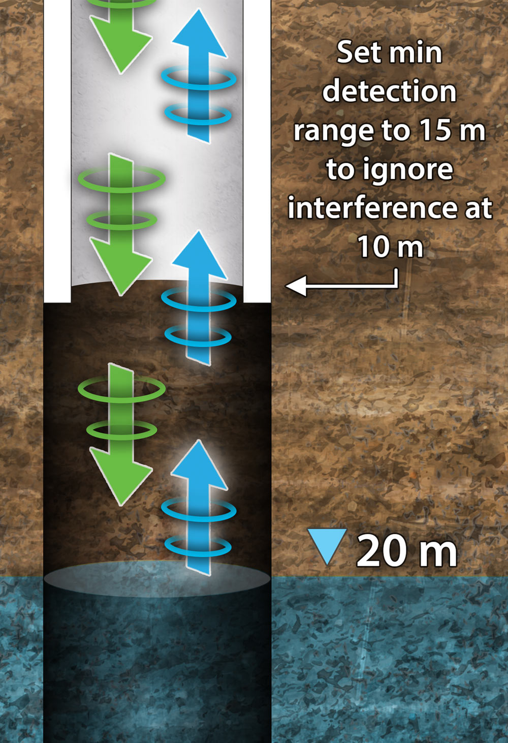 Tuttavia, interferenze più grandi, come bruschi cambiamenti nel diametro del rivestimento del piezometro, potrebbero riflettere abbastanza l'impulso da generare una lettura errata. Per ovviare a questo tipo di problematiche lo strumento consente di impostare un intervallo minimo di rilevamento, in modo tale da escludere qualsiasi anomalia presente al di sopra di tale intervallo.