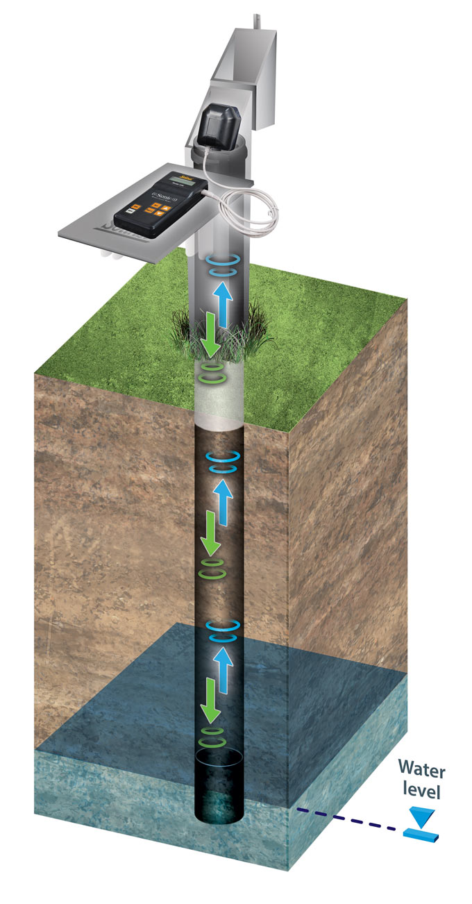la sonda trasmette un'onda sonora nel tubo o nel pozzo e misura il tempo di ritorno impiegato dall'impulso a ritornare alla sonda dopo aver raggiunto la superficie dell'acqua.